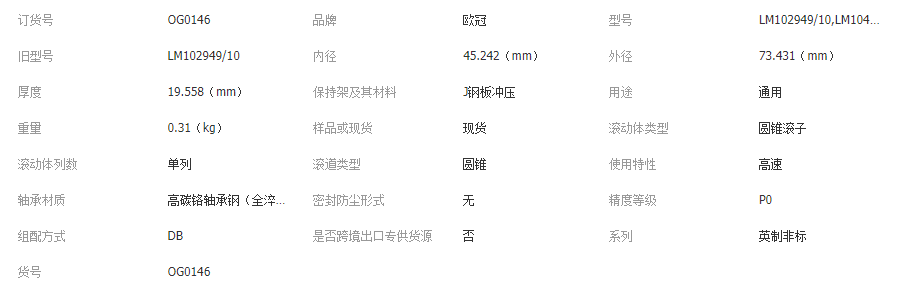 山东欧冠轴承制造有限公司拥有丰富的现货库存,轴承类型包括:圆锥滚子轴承、调心滚子轴承、深沟球轴承、圆柱滚子轴承、角接触球轴承、陶瓷轴承、推力球轴承、调心球轴承、推力滚子轴承、滚针轴承、直线轴承、关节轴承、带座外球面轴承、滚珠丝杠轴承、滑动轴承、交叉滚子轴承、回转支承轴承、不锈钢轴承、塑料轴承等。 产品主要为工业、机械、轧机、纺织、铁路、冶金、矿山等各大名优厂商和经销商提供配套,随时给您技术上的支持协助。 自成立以来以优质的售前技术支持及售后跟踪服务面对每一位客户,秉承"品质保证、品种齐全、价格优惠、供货及时"的公司宗旨,遵守"诚实,务实,共赢"的经营理念,提供给客户最优质的服务和最好的产品质量。公司还将在进口轴承的选择,应用指导,性能测试,技术交流等方面向用户提供完善的服务,充分体现本公司与客户极力配合的精神,使所有客户对我们产品的各个方面都充满信心。真诚期待与更多客户、朋友一起携手合作,共铸事业辉煌。热忱欢迎业界有识之士前来洽谈合作。