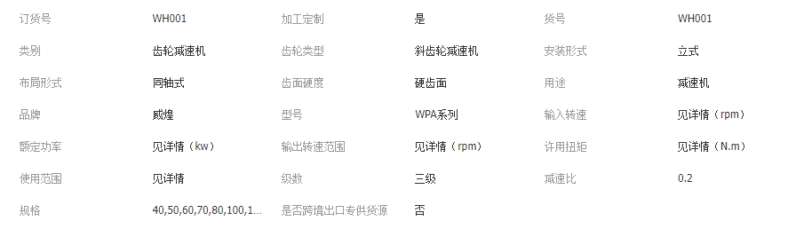 本网页所展示的有关【WPA系列蜗轮蜗杆变速机 微型小型减速器滚轮架减速机 涡轮减速箱_液压减速机_浙江威煌减速机有限公司】的信息/图片/参数等由全球零部件网的会员【浙江威煌减速机有限公司】提供,由全球零部件网会员【浙江威煌减速机有限公司】自行对信息/图片/参数等的真实性、准确性和合法性负责,本平台(本网站)仅提供展示服务,请谨慎交易,因交易而产生的法律关系及法律纠纷由您自行协商解决,本平台(本网站)对此不承担任何责任。您在本网页可以浏览【WPA系列蜗轮蜗杆变速机 微型小型减速器滚轮架减速机 涡轮减速箱_液压减速机_浙江威煌减速机有限公司】有关的信息/图片/价格等及提供【WPA系列蜗轮蜗杆变速机 微型小型减速器滚轮架减速机 涡轮减速箱_液压减速机_浙江威煌减速机有限公司】的商家公司简介、江南(中国)等信息。