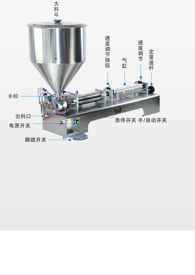 | 灌装量 | 型号 | 灌装头 | 产能 | 功率 | 气源 | 重量 | 尺寸 | 料斗 |