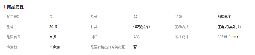 本网页所展示的有关【厂家直供压电式SFM27-D有源3015引线蜂鸣器ABS耐高温电声器件喇叭_蜂鸣器_常州市新奥电子有限公司】的信息/图片/参数等由全球零部件网的会员【常州市新奥电子有限公司】提供,由全球零部件网会员【常州市新奥电子有限公司】自行对信息/图片/参数等的真实性、准确性和合法性负责,本平台(本网站)仅提供展示服务,请谨慎交易,因交易而产生的法律关系及法律纠纷由您自行协商解决,本平台(本网站)对此不承担任何责任。您在本网页可以浏览【厂家直供压电式SFM27-D有源3015引线蜂鸣器ABS耐高温电声器件喇叭_蜂鸣器_常州市新奥电子有限公司】有关的信息/图片/价格等及提供【厂家直供压电式SFM27-D有源3015引线蜂鸣器ABS耐高温电声器件喇叭_蜂鸣器_常州市新奥电子有限公司】的商家公司简介、江南(中国)等信息。