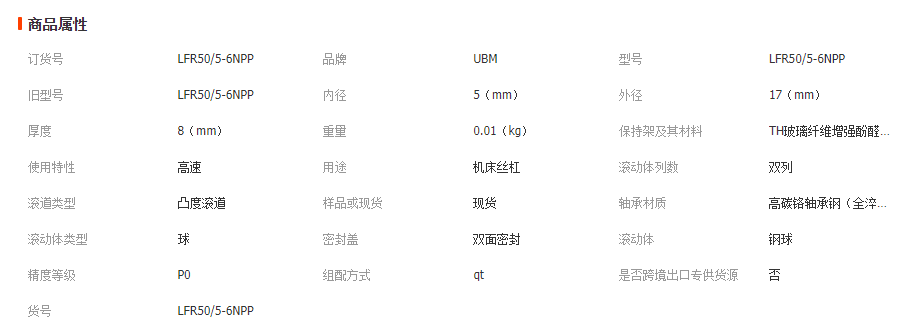 4.LFR50/5-6NPP、R50/5-6 2RS滚轮用优质轴承钢制造,经热处理、精密磨削加工而成,内部填充长寿命的高品质油脂。UBM也可以提供各种R角外圈、带内螺纹、同心轴、偏心轴和耐腐蚀的不锈钢的滚轮。