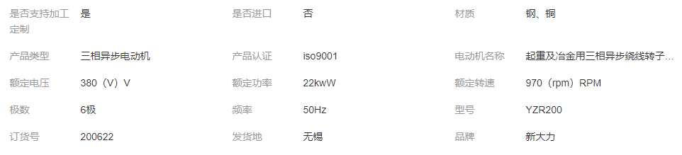 本网页所展示的有关【新大力电机YZR200L-6 22KW绕线转子三相冶金起重电机_驱动电机_无锡新大力电机有限公司】的信息/图片/参数等由全球零部件网的会员【无锡新大力电机有限公司】提供,由全球零部件网会员【无锡新大力电机有限公司】自行对信息/图片/参数等的真实性、准确性和合法性负责,本平台(本网站)仅提供展示服务,请谨慎交易,因交易而产生的法律关系及法律纠纷由您自行协商解决,本平台(本网站)对此不承担任何责任。您在本网页可以浏览【新大力电机YZR200L-6 22KW绕线转子三相冶金起重电机_驱动电机_无锡新大力电机有限公司】有关的信息/图片/价格等及提供【新大力电机YZR200L-6 22KW绕线转子三相冶金起重电机_驱动电机_无锡新大力电机有限公司】的商家公司简介、江南(中国)等信息。