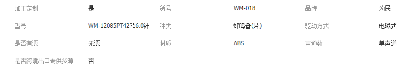 本网页所展示的有关【厂家直供无源电磁式蜂鸣器WM-12085PT42欧6.0针3V-5V蜂鸣器片喇叭_蜂鸣器_宿迁市为民电子科技有限公司】的信息/图片/参数等由全球零部件网的会员【宿迁市为民电子科技有限公司】提供,由全球零部件网会员【宿迁市为民电子科技有限公司】自行对信息/图片/参数等的真实性、准确性和合法性负责,本平台(本网站)仅提供展示服务,请谨慎交易,因交易而产生的法律关系及法律纠纷由您自行协商解决,本平台(本网站)对此不承担任何责任。您在本网页可以浏览【厂家直供无源电磁式蜂鸣器WM-12085PT42欧6.0针3V-5V蜂鸣器片喇叭_蜂鸣器_宿迁市为民电子科技有限公司】有关的信息/图片/价格等及提供【厂家直供无源电磁式蜂鸣器WM-12085PT42欧6.0针3V-5V蜂鸣器片喇叭_蜂鸣器_宿迁市为民电子科技有限公司】的商家公司简介、江南(中国)等信息。