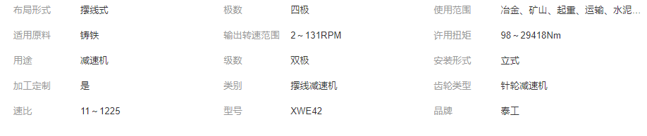 本网页所展示的有关【泰工 双极 冶金、矿山、起重 铸铁 摆线针轮减速机 XWE42_液压减速机_江苏泰工减速机有限公司】的信息/图片/参数等由全球零部件网的会员【江苏泰工减速机有限公司】提供,由全球零部件网会员【江苏泰工减速机有限公司】自行对信息/图片/参数等的真实性、准确性和合法性负责,本平台(本网站)仅提供展示服务,请谨慎交易,因交易而产生的法律关系及法律纠纷由您自行协商解决,本平台(本网站)对此不承担任何责任。您在本网页可以浏览【泰工 双极 冶金、矿山、起重 铸铁 摆线针轮减速机 XWE42_液压减速机_江苏泰工减速机有限公司】有关的信息/图片/价格等及提供【泰工 双极 冶金、矿山、起重 铸铁 摆线针轮减速机 XWE42_液压减速机_江苏泰工减速机有限公司】的商家公司简介、江南(中国)等信息。
