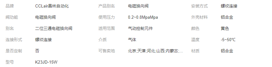 本网页所展示的有关【二位三通电磁阀K23JD-8W,K23JD-10W,K23JD-15W,K23JD-20/25W,_电磁阀_无锡市昌林自动化科技有限公司】的信息/图片/参数等由全球零部件网的会员【无锡市昌林自动化科技有限公司】提供,由全球零部件网会员【无锡市昌林自动化科技有限公司】自行对信息/图片/参数等的真实性、准确性和合法性负责,本平台(本网站)仅提供展示服务,请谨慎交易,因交易而产生的法律关系及法律纠纷由您自行协商解决,本平台(本网站)对此不承担任何责任。您在本网页可以浏览【二位三通电磁阀K23JD-8W,K23JD-10W,K23JD-15W,K23JD-20/25W,_电磁阀_无锡市昌林自动化科技有限公司】有关的信息/图片/价格等及提供【二位三通电磁阀K23JD-8W,K23JD-10W,K23JD-15W,K23JD-20/25W,_电磁阀_无锡市昌林自动化科技有限公司】的商家公司简介、江南(中国)等信息。