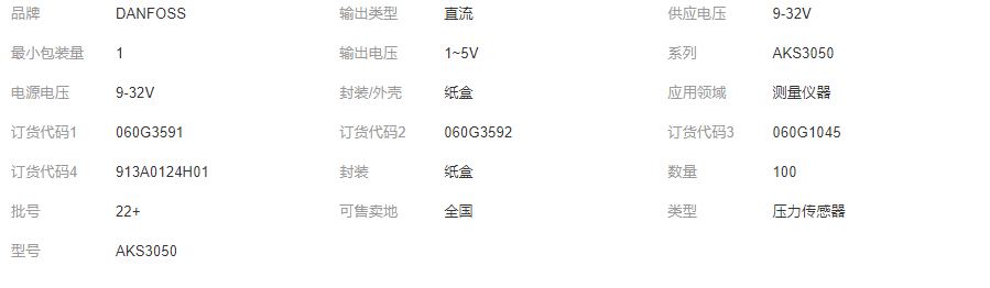 本网页所展示的有关【DANFOSS丹佛斯YOKR定制压力传感器AKS3050 060G3591/913A0124H01_传感器_无锡锡恩动力设备有限公司】的信息/图片/参数等由全球零部件网的会员【无锡锡恩动力设备有限公司】提供,由全球零部件网会员【无锡锡恩动力设备有限公司】自行对信息/图片/参数等的真实性、准确性和合法性负责,本平台(本网站)仅提供展示服务,请谨慎交易,因交易而产生的法律关系及法律纠纷由您自行协商解决,本平台(本网站)对此不承担任何责任。您在本网页可以浏览【DANFOSS丹佛斯YOKR定制压力传感器AKS3050 060G3591/913A0124H01_传感器_无锡锡恩动力设备有限公司】有关的信息/图片/价格等及提供【DANFOSS丹佛斯YOKR定制压力传感器AKS3050 060G3591/913A0124H01_传感器_无锡锡恩动力设备有限公司】的商家公司简介、江南(中国)等信息。