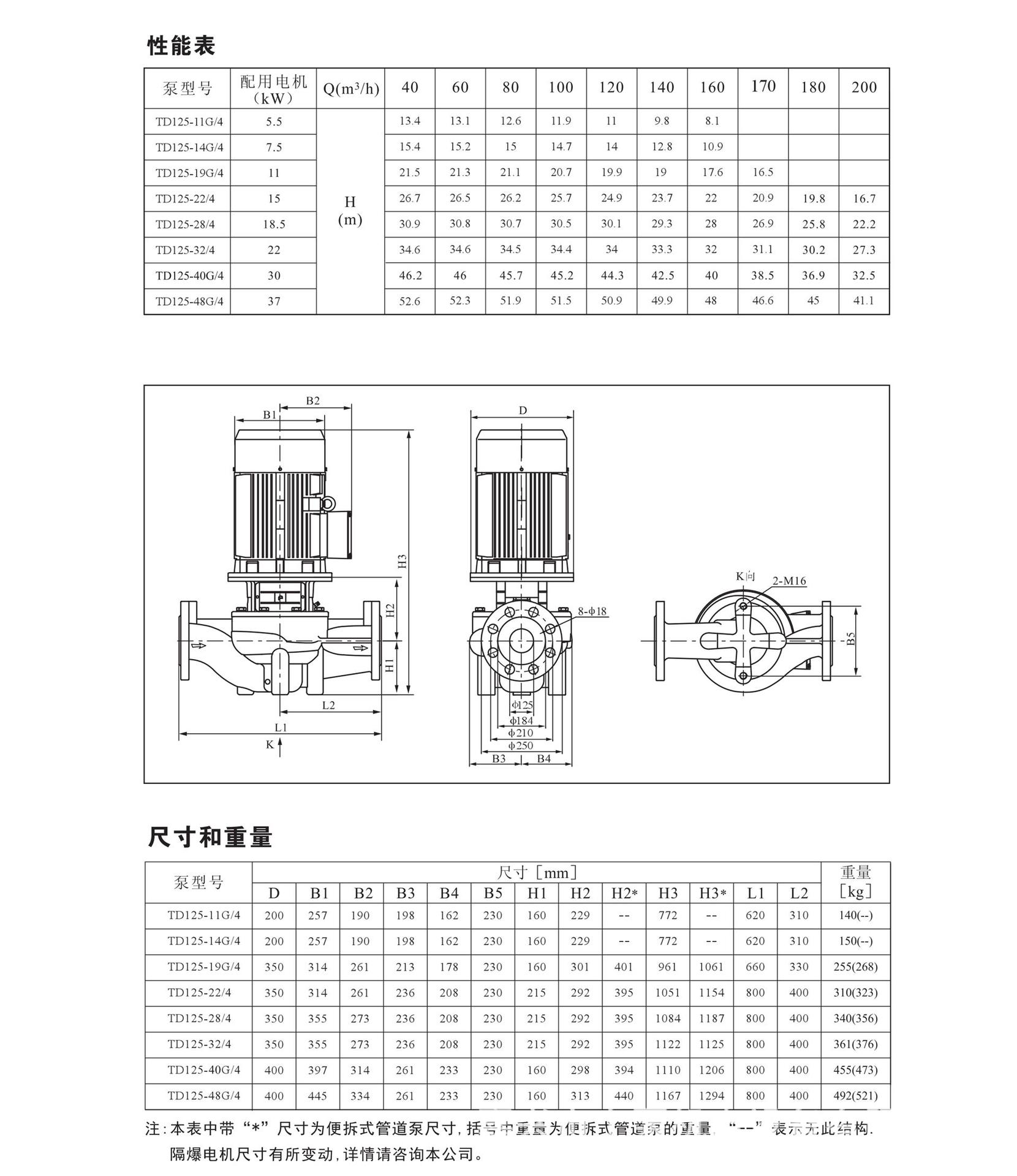8、 为满足客户的不同需要,TD32~-TD150产品分为带底板和不带底板两种。(底板尺寸见附件) TD125-40G/4SWGRB防爆管道泵性能参数:流量:160立方米/小时;扬程:40米;转速:1480转/分钟;电机功率:30KW. TD125-40G/4SWGRB防爆管道泵适宜在清洁、稀薄、非侵蚀、非易燃易爆,且不含有任何可能对泵造成机械或化学损害的固体颗粒和纤维的液体中使用。具体对液体要求及应用如下表2;而在液体粘稠或密度较大情况下使用时会造成泵特性曲线的下降和能耗的增加。 液体温度: -15C~ 110C 最大工作压力:常规型为PN12巴;特殊型为PN16巴。 TD125-40G/4SWGRB防爆管道泵型号含义为:TD-----------------管道循环泵;125----------------------吸排口的额定直径DN为125毫米(mm);40-------------------额定扬程为40米(m);G--------------------新一代;4--------------------电机极数;S------------------三相;W------------------50HZ;G------------------叶轮铸钢;R------------------高温高压型;B------------------防爆电机. TD125-40G/4SWGRB防爆管道泵配有标准电机和机械密封。此类产品的结构与相近类型产品相比,更不易受到泵送液体中杂质的影响。 产品设计为顶部可拉出的拆装形式,其可以在不影响管路系统的情况下对泵进行维修。所有泵采用创新式便拆式机械密封,更换机械密封无需拆卸电机。 TD125-40G/4SWGRB防爆管道泵产品结构 TD125-40G/4SWGRB防爆管道泵采用电机与泵可分离式结构,泵部分设计为可拉出形式。所有的该类产品都配有标准电机和机械密封。电机为全封闭、风冷式标准电机。其主要尺寸符合JB/T8680标准。 TD125-40G/4SWGRB防爆管道泵泵体相当于一段管路。在泵进行维修时,可以用盲法兰将泵体封堵,从而不影响系统的正常运行。 TD125-40G/4SWGRB防爆管道泵的联接法兰尺寸符合GBT17241.6或IS07005-2/DIN2501标准中PN16时的有关规定。 TD125-40G/4SWGRB防爆管道泵的进出口直径符合有关标准尺寸。 TD125-40G/4SWGRB防爆管道泵的泵头是联接电机和泵的装置,其与泵体之间的密封件采用"0"形圈。 TD125-40G/4SWGRB防爆管道泵曲线条件