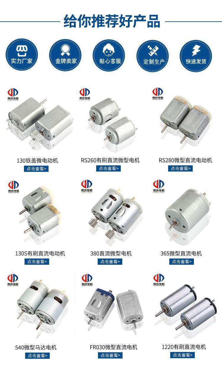 广东嘉达电机(motor)有限公司是一家集设计、开发、生产、销售于一体的微电机专业生产厂家。产品广泛应用于航模、玩具、家用电器、视听设备、车载DVD、电子门锁、电动牙刷、剃须刀、电吹风、舞台灯光、汽车门锁、后视镜,自动验抄机、气泵水泵等设备。目前具备生产能力机种:030、130、140、FF180、260、280、360(365)、380(385)、390、540(545)、550(555)、750(755),转向电机等系列组成。