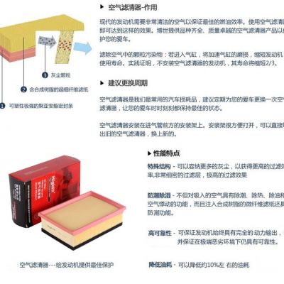 产品功能:清除空气中灰尘微粒杂质,避免颗粒物吸入发动机造成零件磨损。