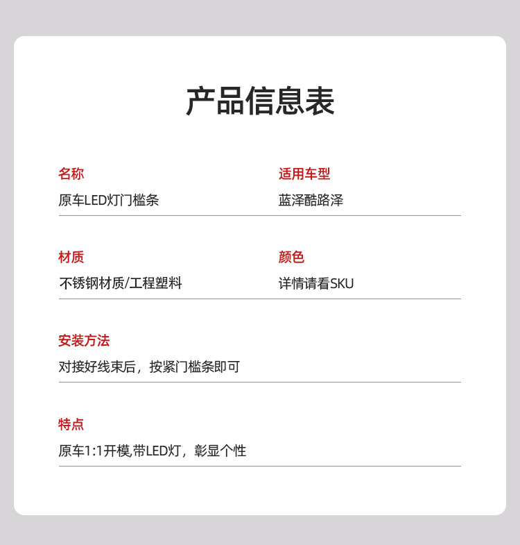 本网页所展示的有关【兰德酷路泽LC200/LC300改装门槛条LED迎宾踏板流光带灯丰12-23田_ HVAC汽车_广州迈保蓝汽车用品有限公司】的信息/图片/参数等由全球零部件网的会员【广州迈保蓝汽车用品有限公司】提供,由全球零部件网会员【广州迈保蓝汽车用品有限公司】自行对信息/图片/参数等的真实性、准确性和合法性负责,本平台(本网站)仅提供展示服务,请谨慎交易,因交易而产生的法律关系及法律纠纷由您自行协商解决,本平台(本网站)对此不承担任何责任。您在本网页可以浏览【兰德酷路泽LC200/LC300改装门槛条LED迎宾踏板流光带灯丰12-23田_ HVAC汽车_广州迈保蓝汽车用品有限公司】有关的信息/图片/价格等及提供【兰德酷路泽LC200/LC300改装门槛条LED迎宾踏板流光带灯丰12-23田_ HVAC汽车_广州迈保蓝汽车用品有限公司】的商家公司简介、江南(中国)等信息。