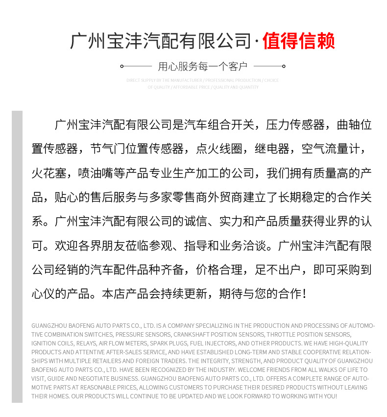 本网页所展示的有关【现代起亚火花塞18846-10060火嘴适用于现代起亚ILZKR6B10厂家供应_火花塞_广州宝沣汽配有限公司】的信息/图片/参数等由全球零部件网的会员【广州宝沣汽配有限公司】提供,由全球零部件网会员【广州宝沣汽配有限公司】自行对信息/图片/参数等的真实性、准确性和合法性负责,本平台(本网站)仅提供展示服务,请谨慎交易,因交易而产生的法律关系及法律纠纷由您自行协商解决,本平台(本网站)对此不承担任何责任。您在本网页可以浏览【现代起亚火花塞18846-10060火嘴适用于现代起亚ILZKR6B10厂家供应_火花塞_广州宝沣汽配有限公司】有关的信息/图片/价格等及提供【现代起亚火花塞18846-10060火嘴适用于现代起亚ILZKR6B10厂家供应_火花塞_广州宝沣汽配有限公司】的商家公司简介、江南(中国)等信息。