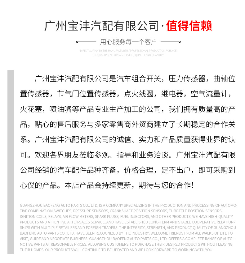 本网页所展示的有关【汽车火花塞批发90919-01210铱铂金SK20R11适用RAV4凯美瑞雅力士_火花塞_广州宝沣汽配有限公司】的信息/图片/参数等由全球零部件网的会员【广州宝沣汽配有限公司】提供,由全球零部件网会员【广州宝沣汽配有限公司】自行对信息/图片/参数等的真实性、准确性和合法性负责,本平台(本网站)仅提供展示服务,请谨慎交易,因交易而产生的法律关系及法律纠纷由您自行协商解决,本平台(本网站)对此不承担任何责任。您在本网页可以浏览【汽车火花塞批发90919-01210铱铂金SK20R11适用RAV4凯美瑞雅力士_火花塞_广州宝沣汽配有限公司】有关的信息/图片/价格等及提供【汽车火花塞批发90919-01210铱铂金SK20R11适用RAV4凯美瑞雅力士_火花塞_广州宝沣汽配有限公司】的商家公司简介、江南(中国)等信息。
