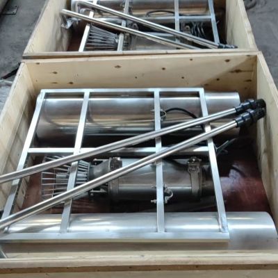 5、潜水式流曝气机采用优质的SUS304 不锈钢制造,完全耐各种腐蚀性水体。推流曝气机由专用电动机、叶轮、浮筒、浮筒底座、吸气室、吸气管、专用保护开关等组成。产品结构紧凑、高性能、低损耗、重量轻、安装简单、操作方便,射流喷气角度可跟据需要来调整,可向上下自由调节60 度(适合各种池底),工作区域的水体深度不得浅于0.50 米(自然底)。
