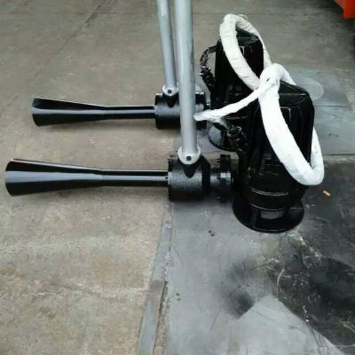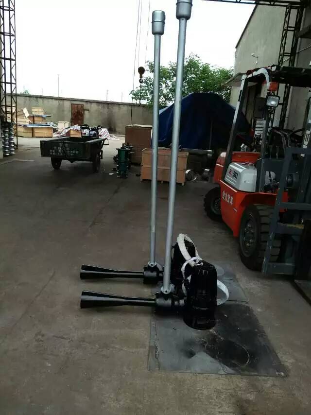 (6)潜水曝气机电机设备通过改变方立柱上分度盘的插销孔位,即可在120°的范围内调节方向。起吊架可360°旋转,能方便地将主机起落在安装平台上。可吊放主机,也可将曝气机提升至水上进行维护、保养。