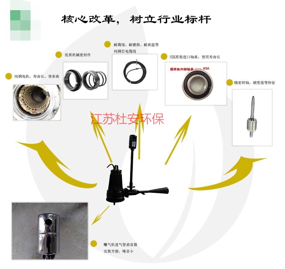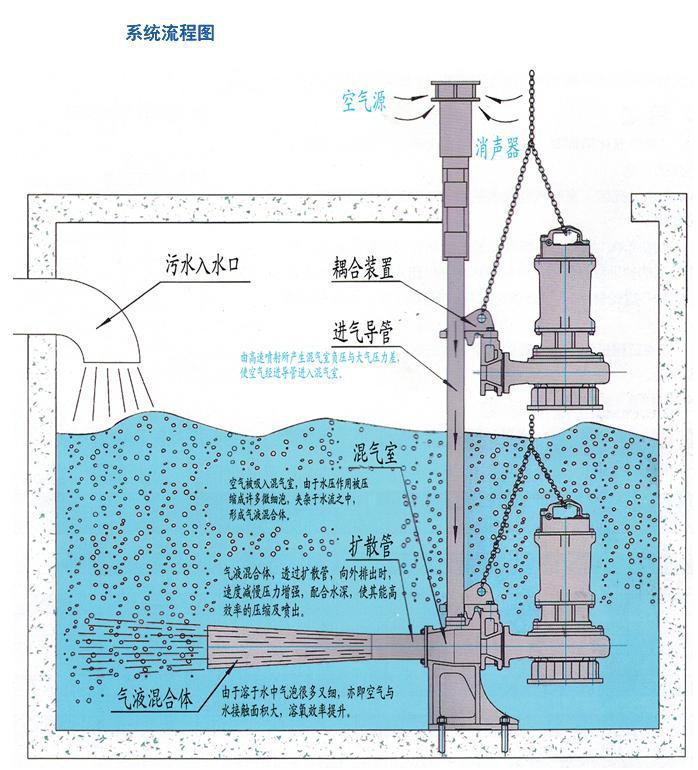 3、不锈钢潜水射流曝气机体系简略,可靠性高。无需鼓风机等设备,体系简略,除吸气口外,其余部分均潜入水中运转,噪音小;曝气机选用专用带切开潜污泵,高效无堵塞,设备安全可靠,使用寿命长。