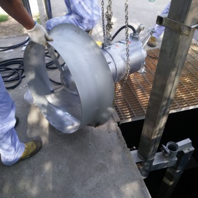 潜水搅拌机采用具有良好自清功能、工作时无振动、且经过优化设计的轴流叶轮,并经过动平衡试验。叶轮能快速地搅拌推动池底流体的流动。所有桨叶都应具有相同的形状。